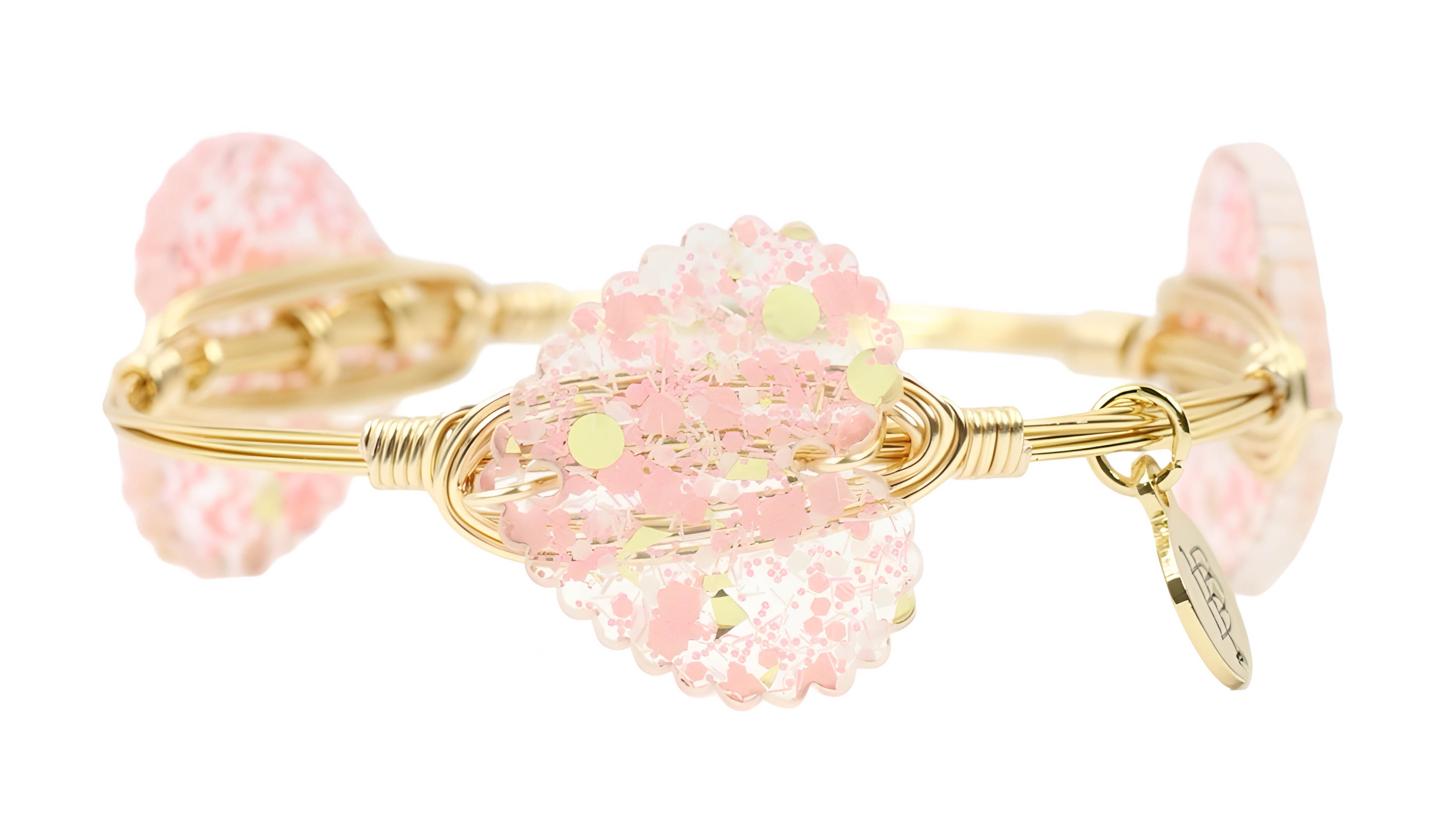Gold plated copper wire-wrapped bangle adorned with three acrylic pieces.